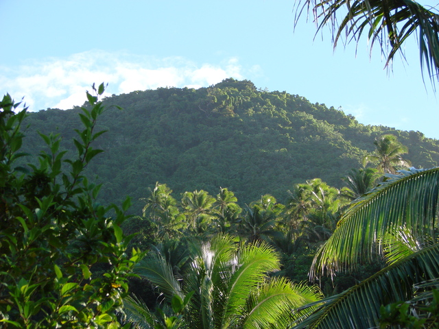 Hinter Cocos-Hainen die unerreichbar-steilen noch bewaldeten Hänge der NO-Küste